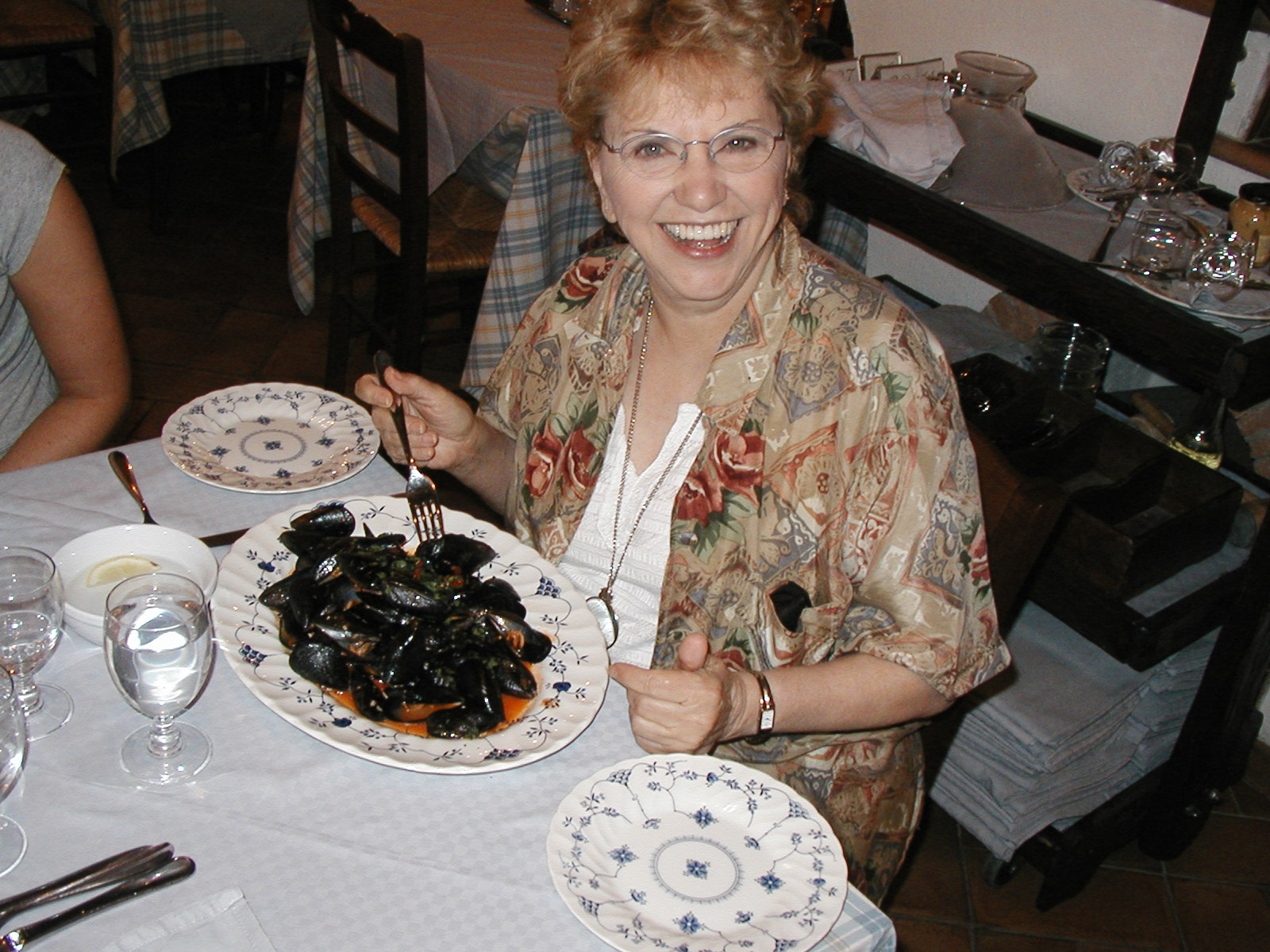 My mom, Win Perman, enjoying some steamed mussels in Sorrento ten years ago.