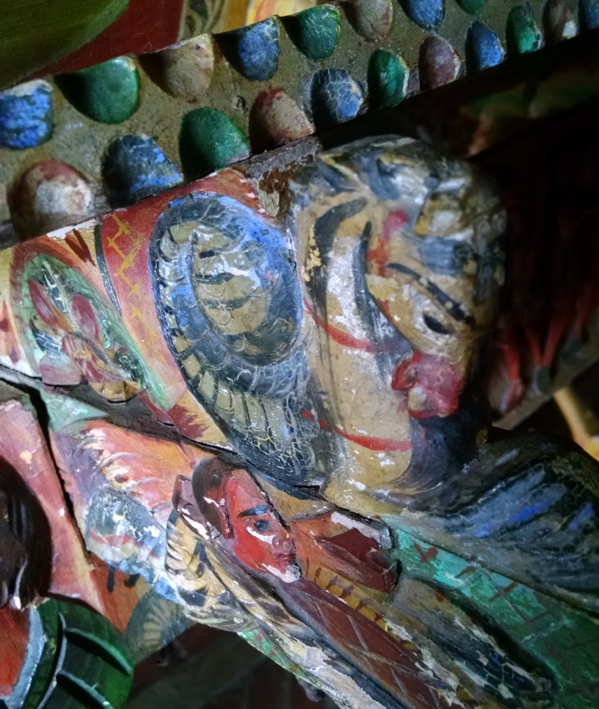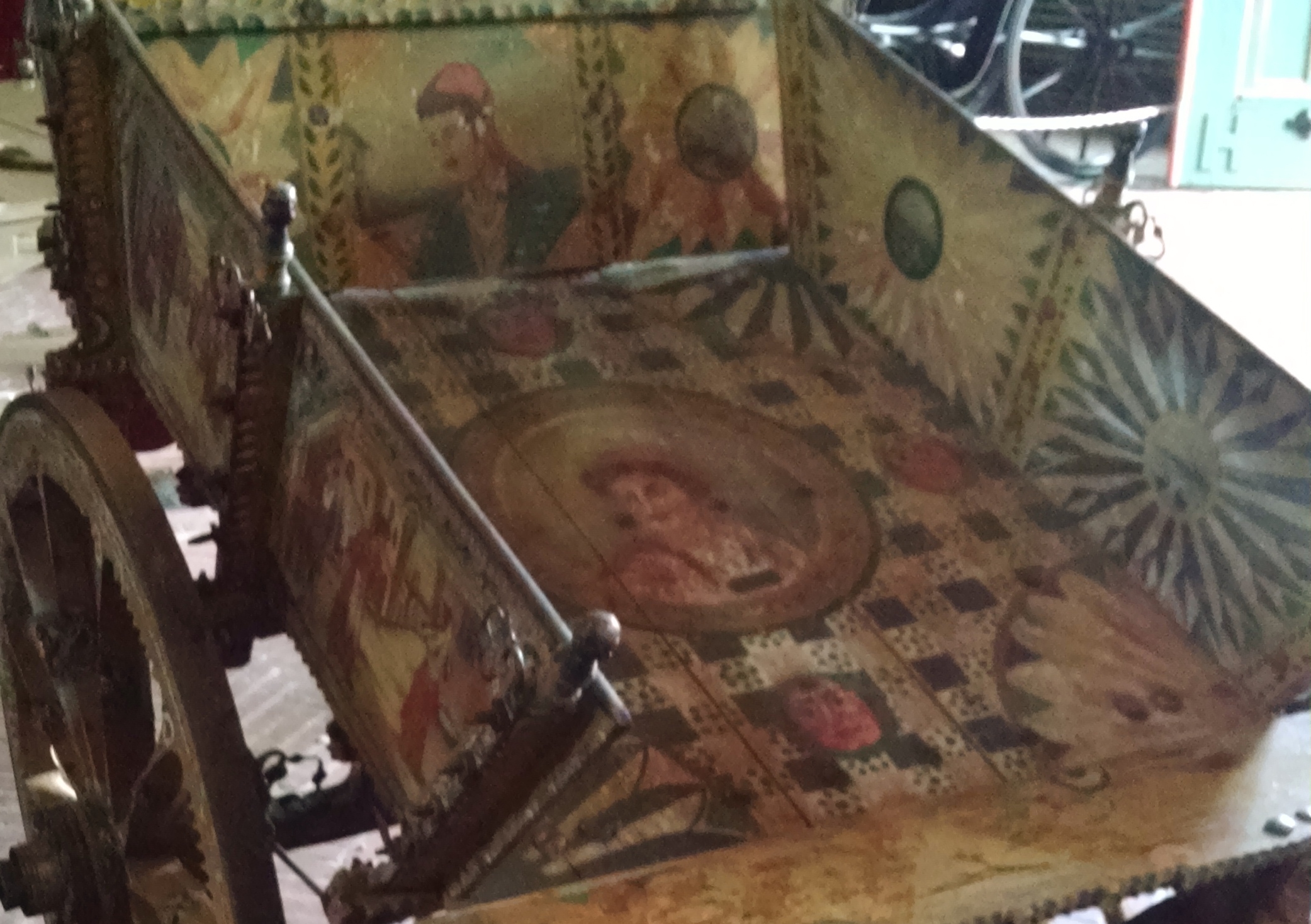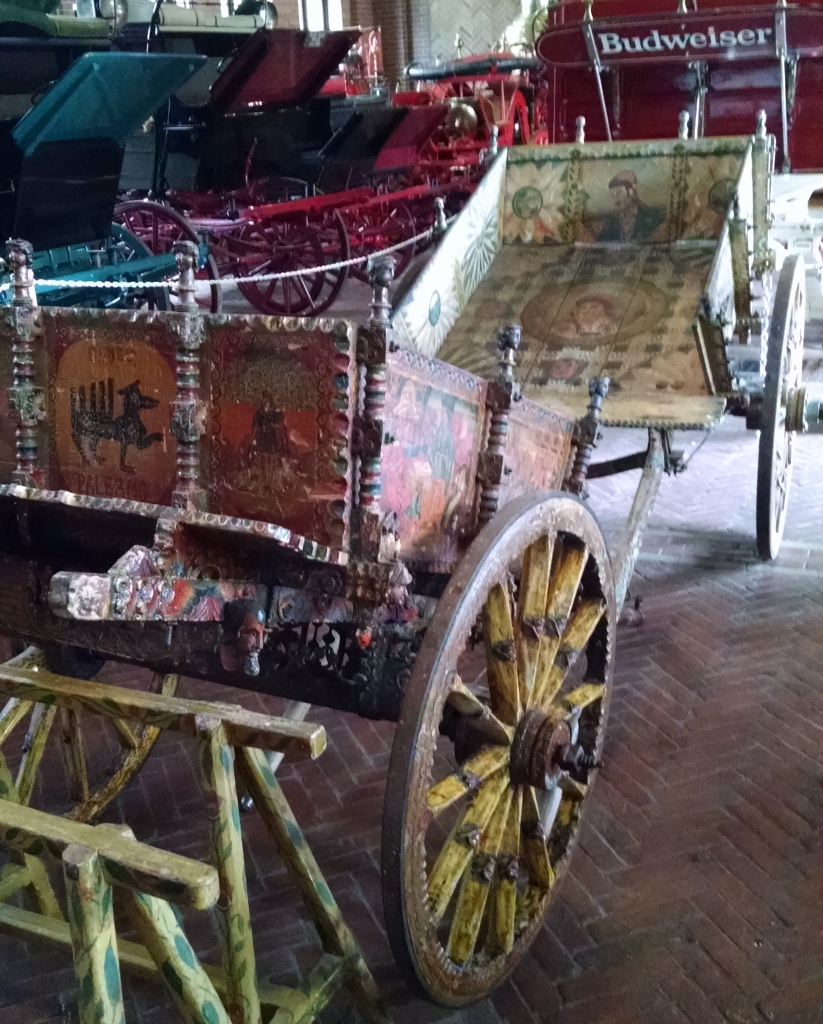 And there I found the unexpected, the Sicilian surprise: A beautiful pair of Sicilian wedding carts dating from the 1700s. Traditionally pulled by donkeys, the carts were the smallest vehicles in the collection. I hope my photos give you a glimpse of the Sicilian history they represent. One is for the bride and one for the groom. The detailed carving and bright color stood in high contrast to the gleaming black carriages and bright red Budweiser wagon nearby!