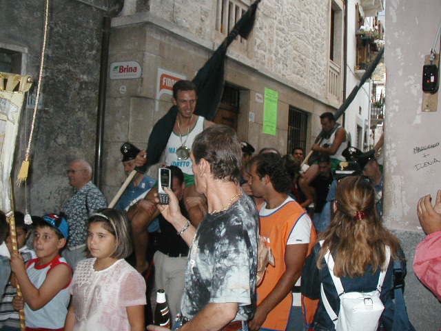 A public address system, strung up to a high eave, broadcast tinny announcements that could be heard for several blocks. As the racers climbed the hill to the starting line, Cesare told about the origins of the race, when gypsies camped outside the city saw an enemy approaching, and ran barefoot down the hill, across the valley, and up to the hilltop town of Pacentro to warn them, allowing the town to fend off the danger. In honor of the “Zingari”, or Gypsies, who saved Pacentro, the annual Corsa degli Zingari, (Race of the Gypsies), is celebrated every year. It has become a coming-of-age ritual for the young men of Pacentro. The prize seems odd–a bolt of cloth. But this was the fabric used to make his first suit of clothes as a man, and young men still compete vigorously for the title, running barefoot across the rough terrain.