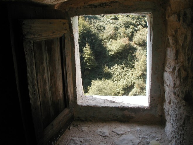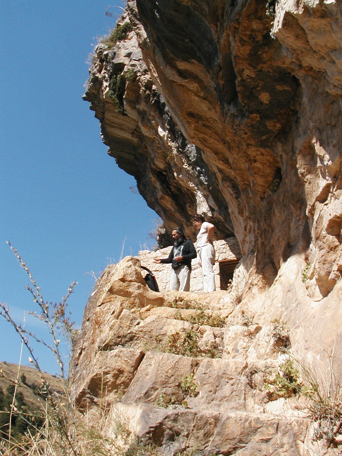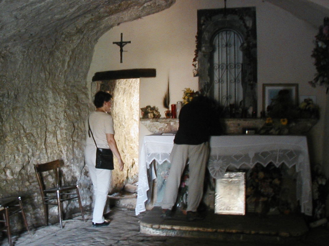 On a hot, clear September afternoon Vern and I followed our friend Cesare along a trail through dry grass on the slopes of Maiella. Our destination: one of the dozens of hermitages in the mountains of Abruzzo, San Bartolomeo in Legio. Pilgrims still visit the site, most commonly on August 25 each year. The narrow trail and ledge discourage crowds!