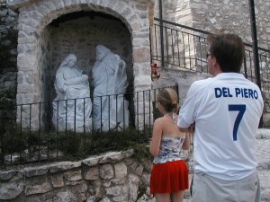 I was still absorbing the historical shock when the ringing of bells signaled the start of the race. We watched them run down the rocky, forested hillside, disappearing into the pines, and reappearing to the cheers of viewers around us. By the time they begin to arrive in the town, within fifteen or twenty minutes as I recall, they are blistered and sometimes bloody. From the finish line, racers are paraded through the narrow crowded streets on the shoulders of their friends.