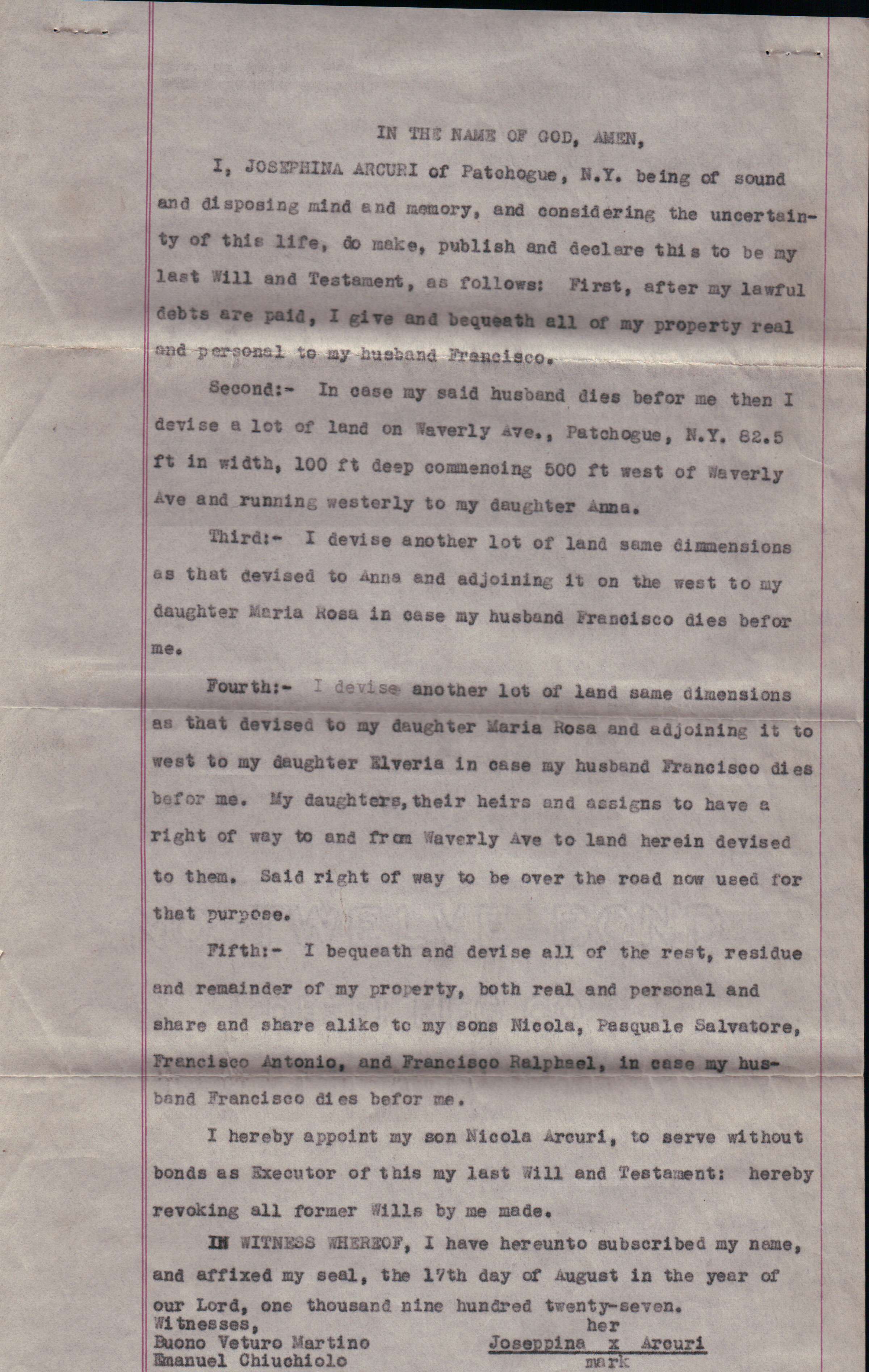 My mother found a copy recently of a will made by my great-grandmother, Josephine (Gualtieri) Arcuri in August of 1927. At that time my grandmother, Mary Nancy (Arcuri) Sanders was twenty years old, already married with a six-month-old daughter. Josephine’s three eldest were also out on their own, and her youngest children, boys of 19, 17, and 12, all still lived at home.