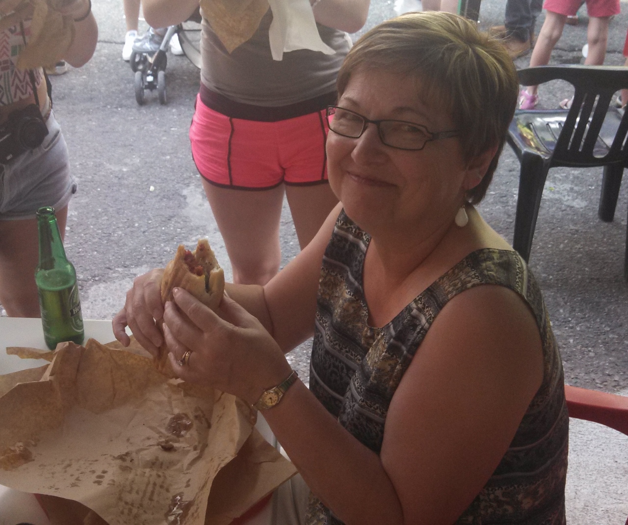 We each had a grilled sausage on a bun with various toppings–sauteed greens, mushrooms, sauces–and beer was the ideal drink in the summer heat. The few tables were crowded, but we were able to join a couple at a larger table, and visited with them in my feeble Italian. They were enjoying their annual tradition of a summer day trip to the lake. The crowd was definitely Italian–we didn’t recognize any other foreign visitors. Our entertainment was the team manning the grill, with one guy warming the bread on a side grill, while two others grilled sausages as fast as they could, taking them from long ropes of sausage hung up above the smoking stove.