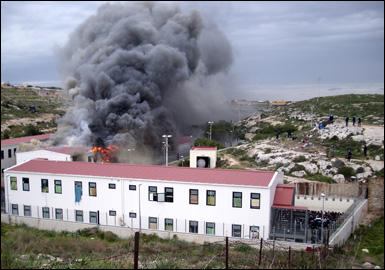 Refugees set fire to immigration center in Lampedusa, from http://www.morningstaronline.co.uk